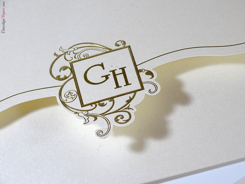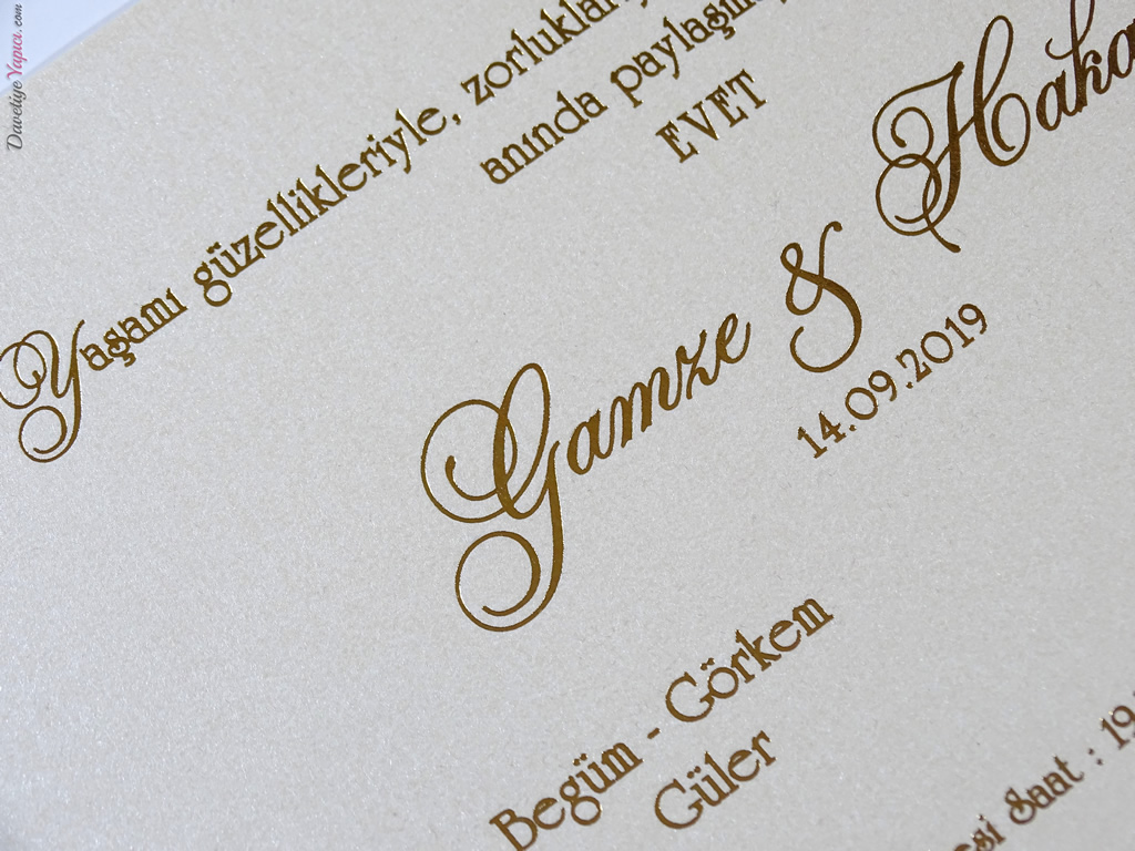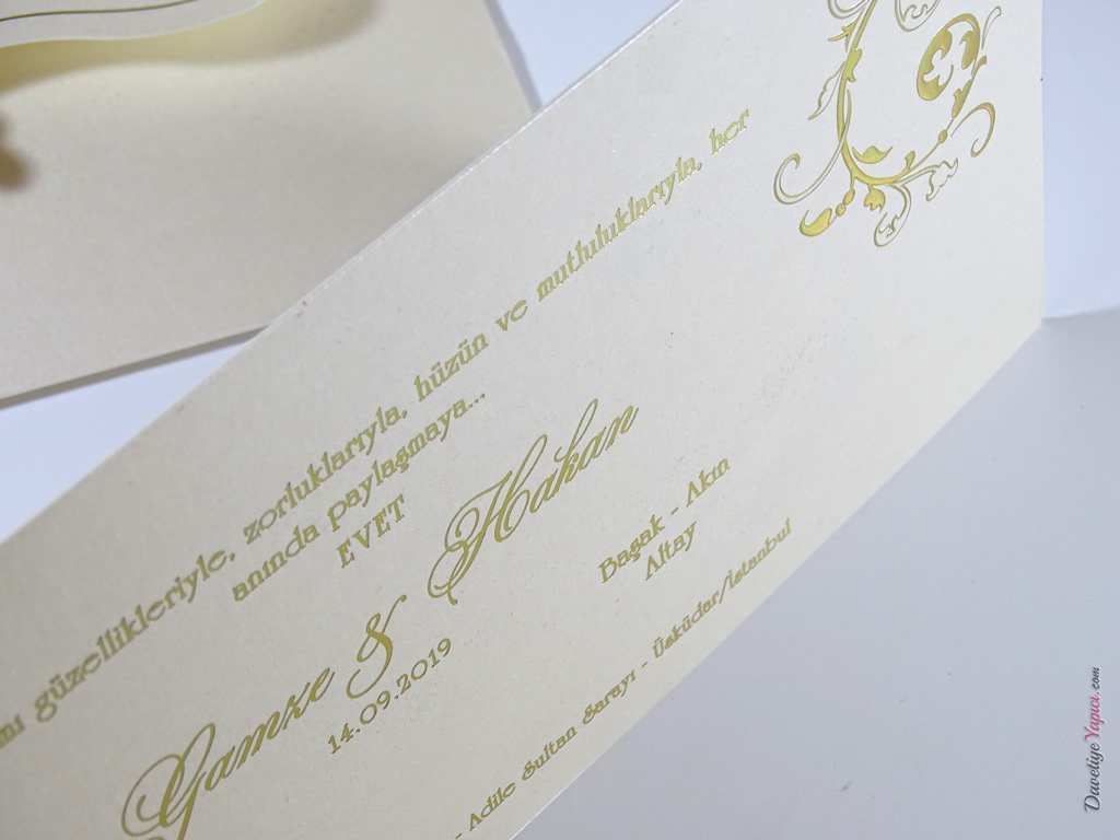 Altın yaldız kabartmalı ve yaldız yazılı davetiye ve yine altın yaldızlı lüks zarf olmak üzere iki parçadan oluşmaktadır.