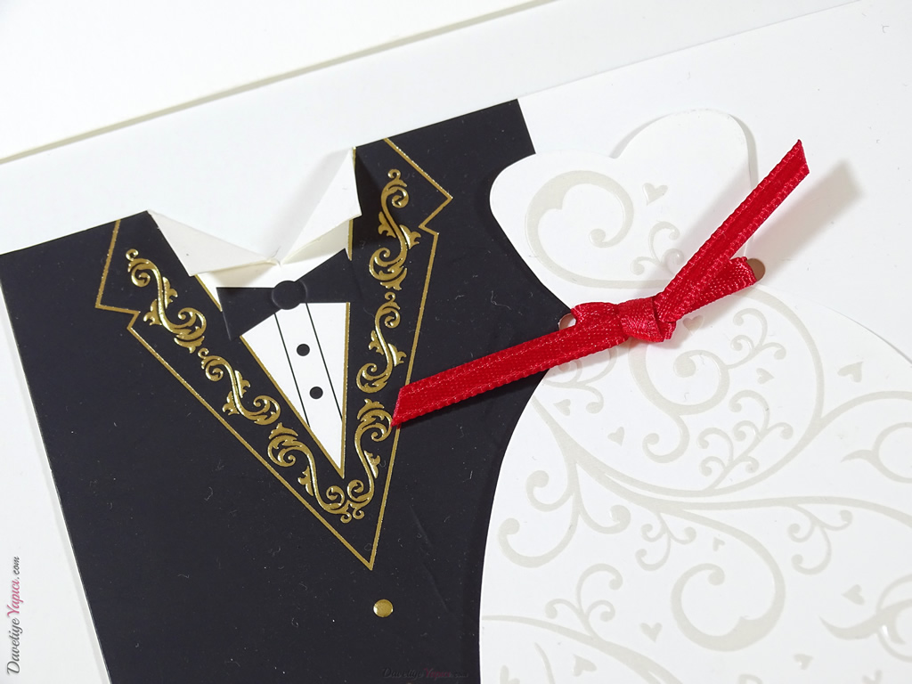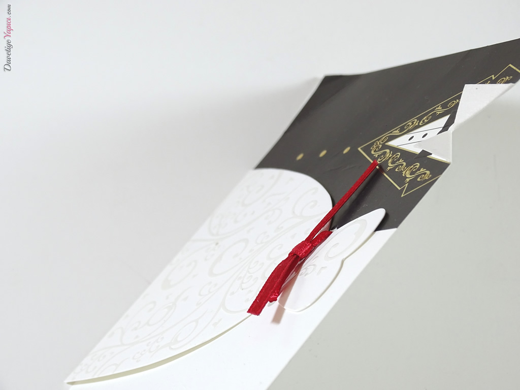 Kabartmalı gelinlik ve damatlık figürlü kırmızı kurdelalı lüks davetiye zarfı ile birlikte iki parçadan oluşmaktadır.
