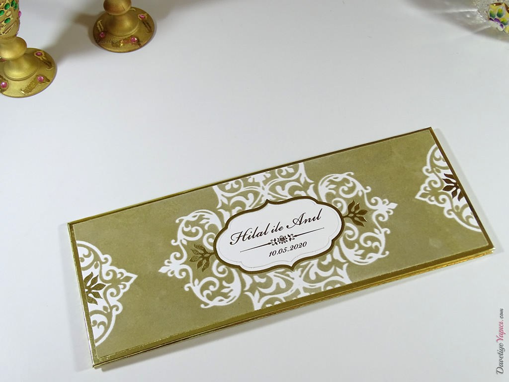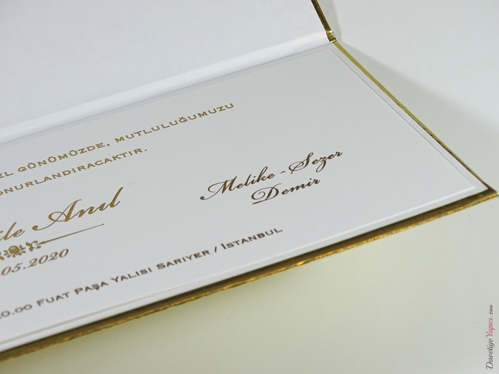 Kapaklı katlanır altın yaldızlı kalın mukavva lüks davetiye zarfsız, tek parçadan oluşmaktadır.