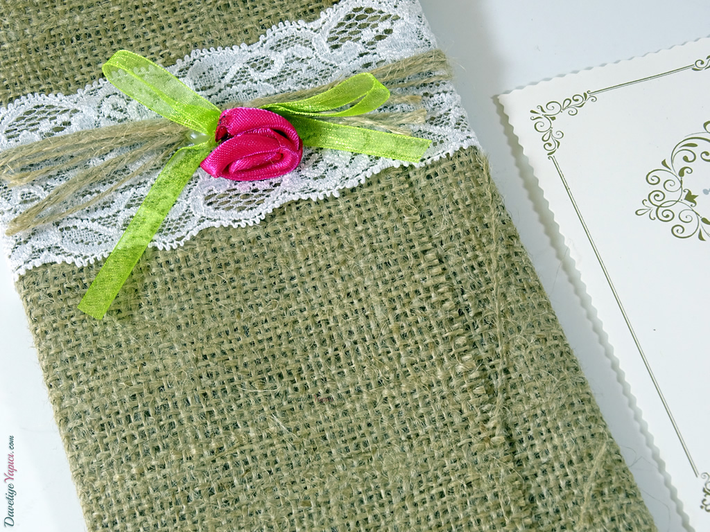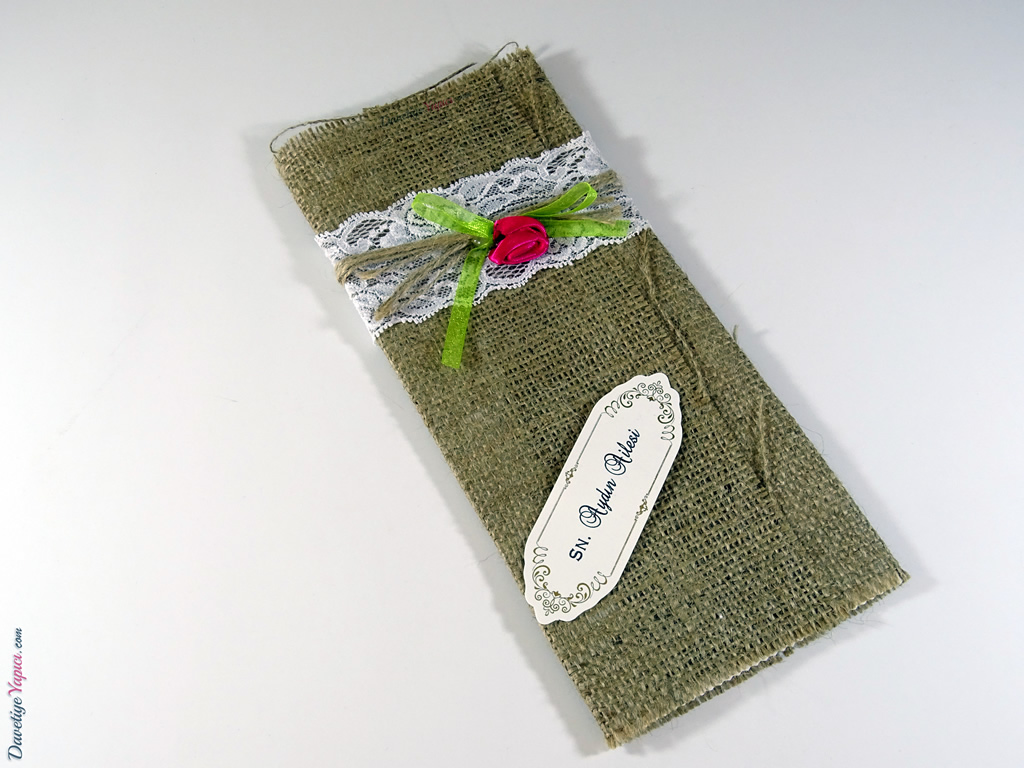 Dış kısımda hasır görünümlü çiçek aksesuarlı kılıf ve iç bölümde altın yaldız işlemeli desenlerden oluşan kart olmak üzere iki parçadan oluşmaktadır.