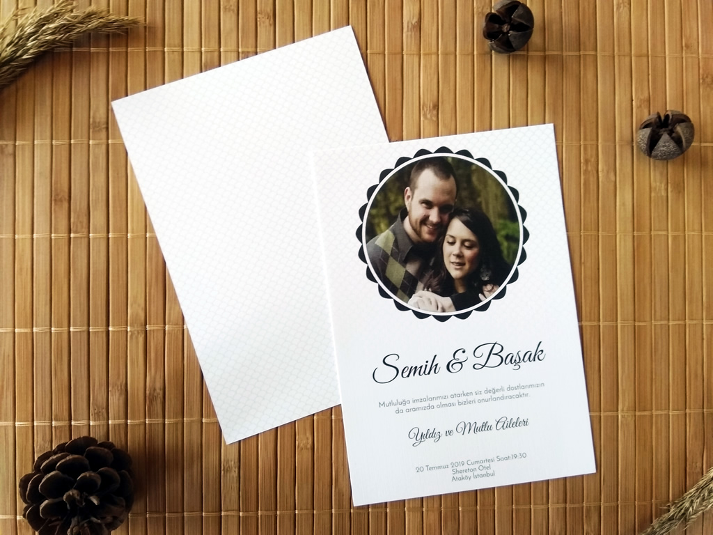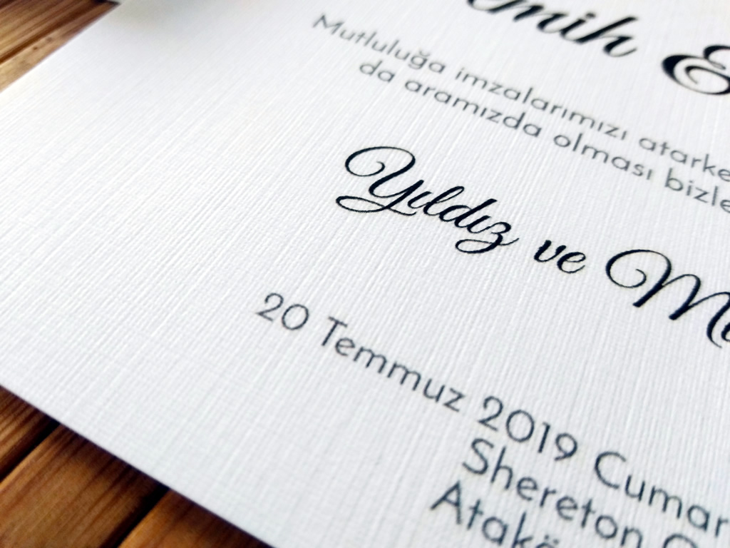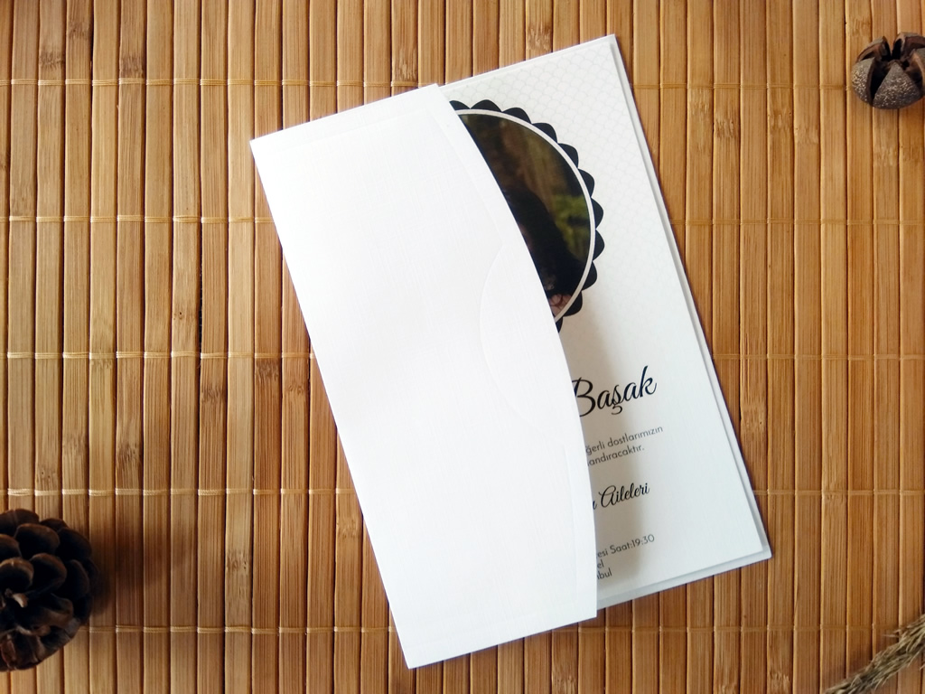 300gr/m2 kalınlığında çizgi dokulu beyaz zarf içine 300gr/m2 kalınlığında iç davetiye kartı üzere iki parçadan oluşmaktadır.