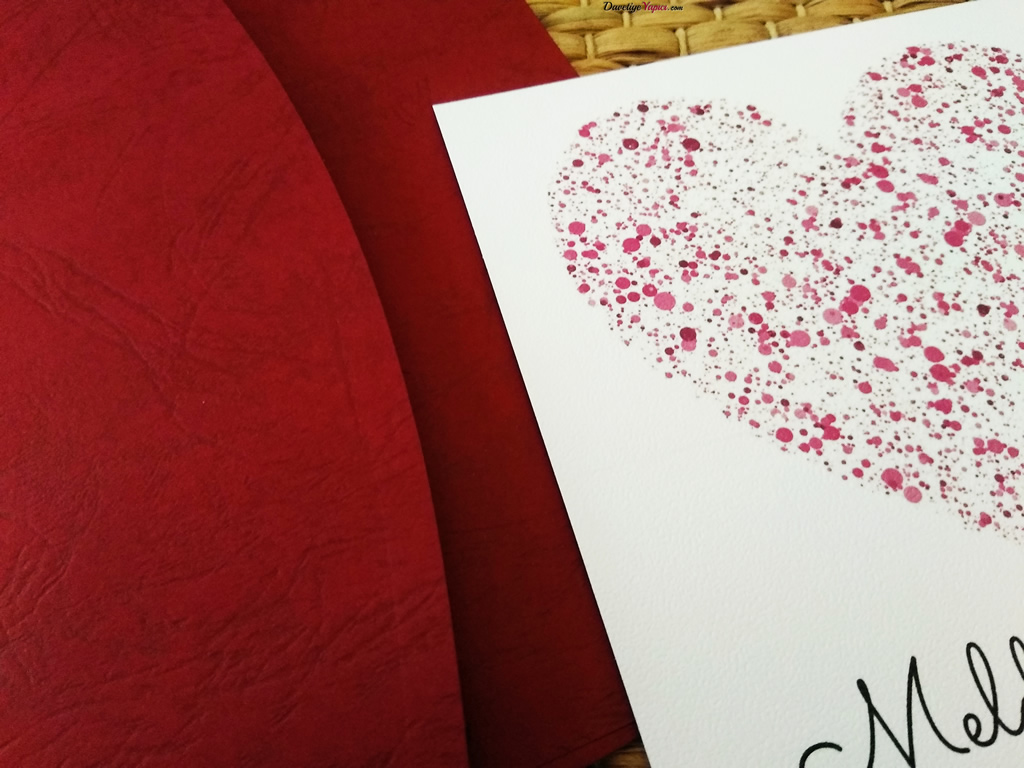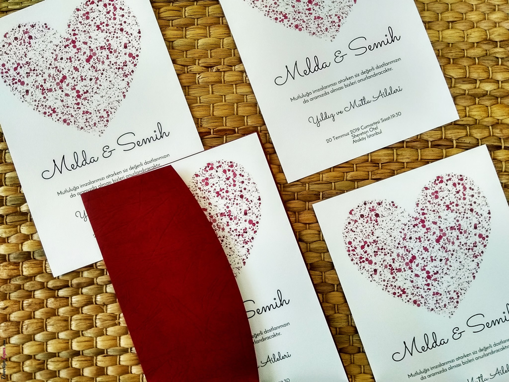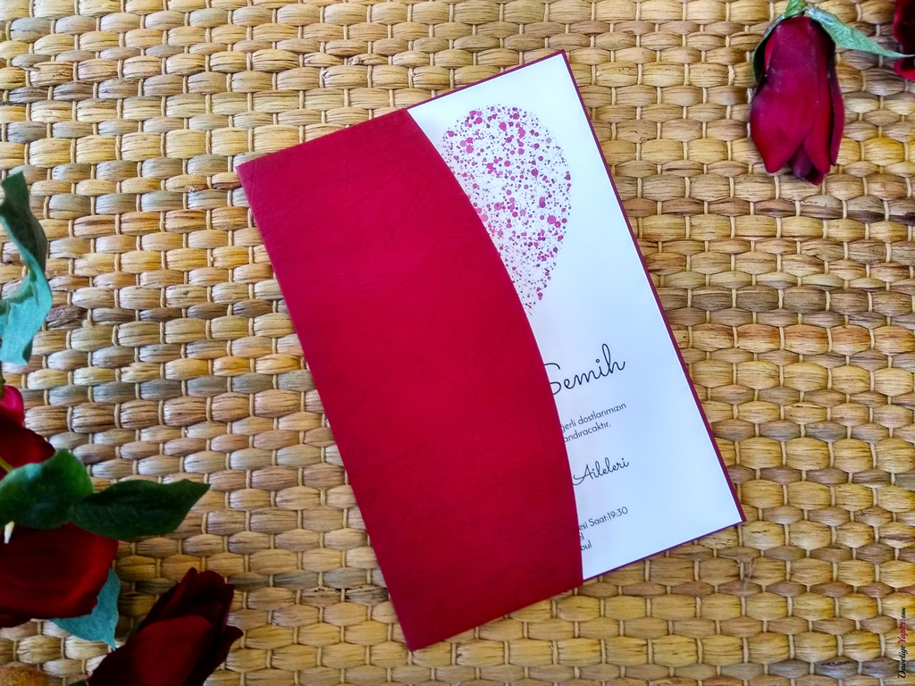 Deri desen bordo 300gr/m2 kalınlığında zarf içinde 1nci kalite dokulu tual zemine suluboya kalp temalı iç davetiye kartı olmak üzere iki parçadan oluşmaktadır.
