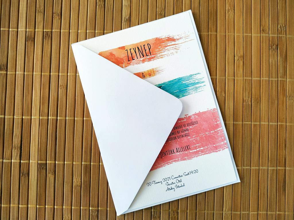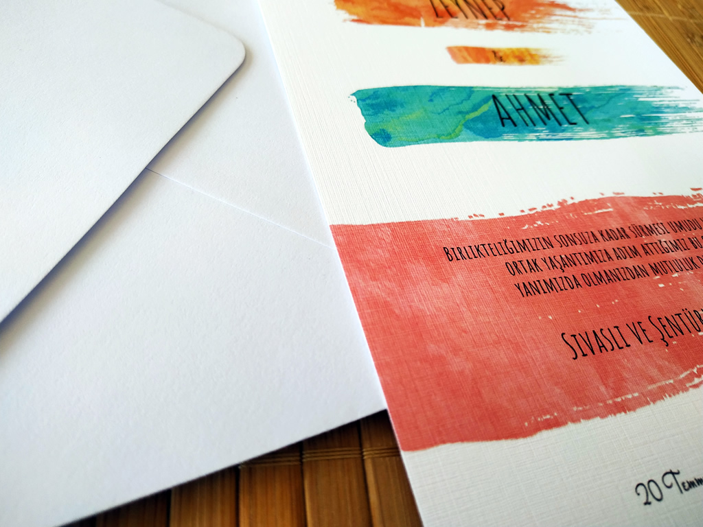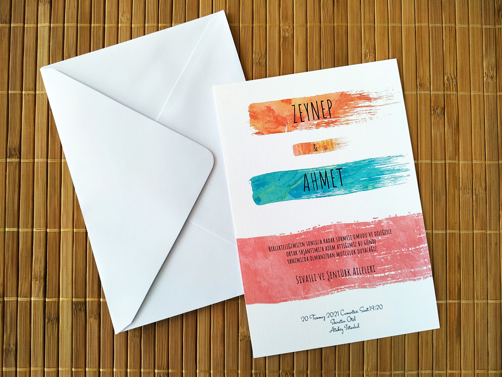 120gr/m2 Beyaz zarf içine 300gr/m2 kalınlığında tual dokulu zemin üzerine fırça darbeleri temalı iç davetiye kartı olmak üzere 2 parçadan oluşmaktadır. Davetiye Ebatları 14x20cm.