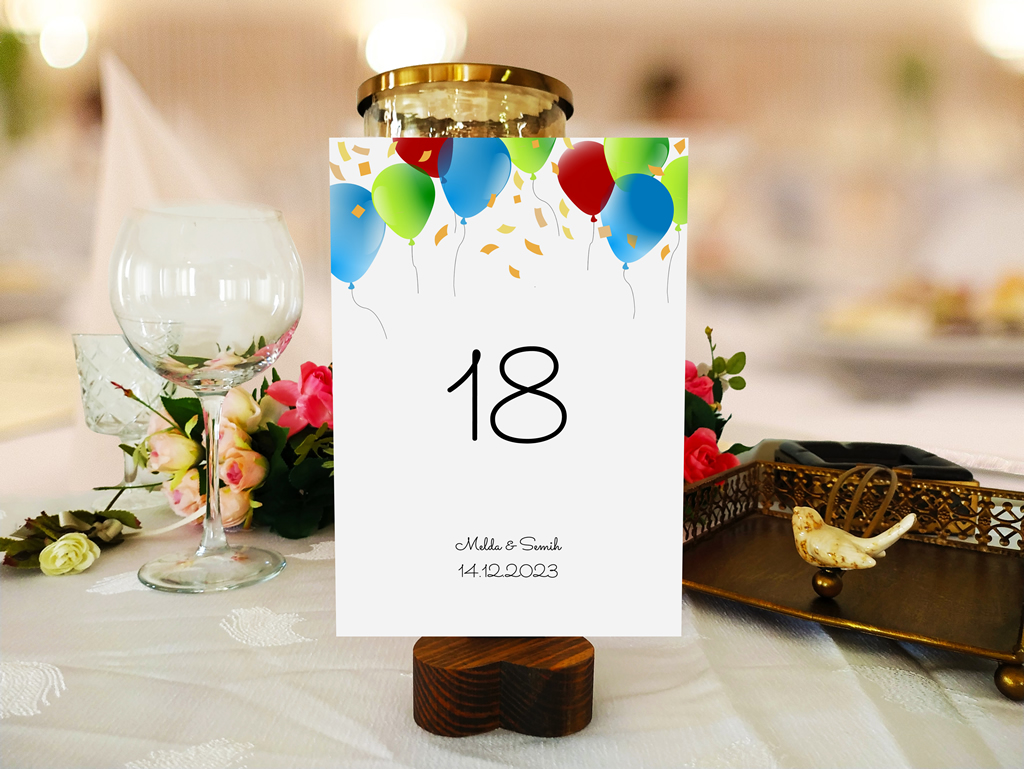 Özel Tasarım 69WedMk Masa Kartı. Kart kuşe zemine balonlar temalı baskıdan oluşmaktadır.