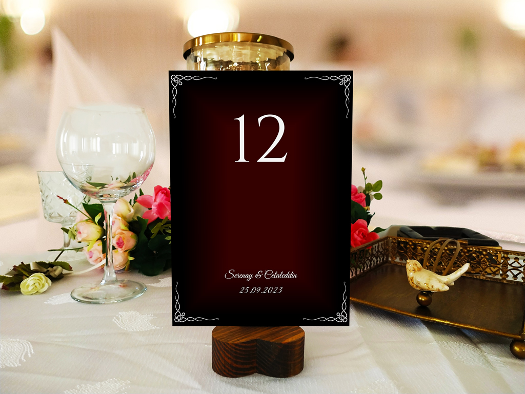 300gr/m2 kalınlığında kuşe bordo zemine beyaz çerçeve temalı masa kartı. Kart Ebatları 14x20cm. Oturma planı düzeninde işinizi kolaylaştıracak, seçkin ve gösterişli Masa Kartları kullanabilirsiniz.
