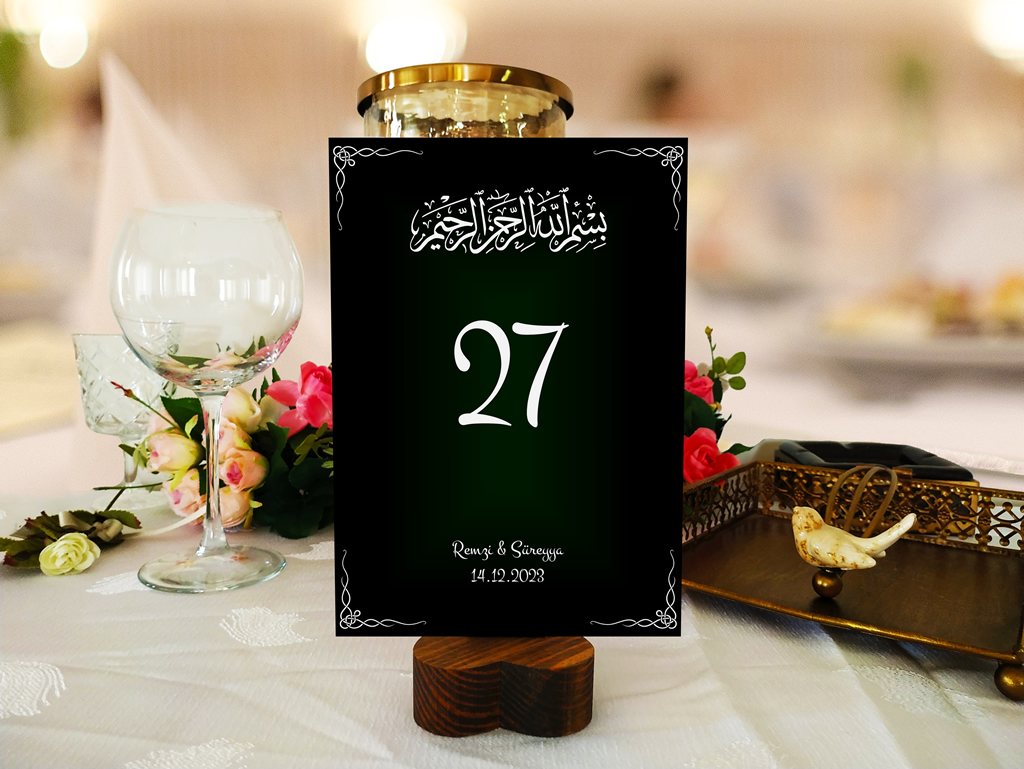 300gr/m2 kalınlığında yeşil/siyah kuşe zemine islami temalı masa kartı. Kart Ebatları 14x20cm. Oturma planı düzeninde işinizi kolaylaştıracak, seçkin ve gösterişli Masa Kartları kullanabilirsiniz.