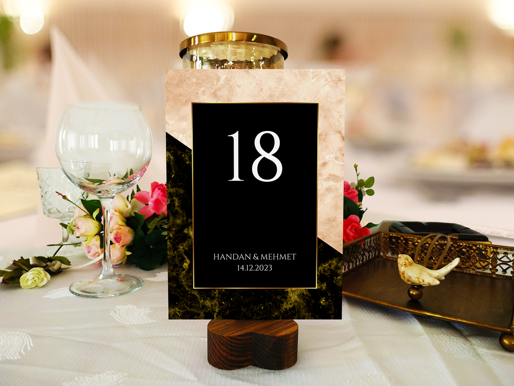 300gr/m2 kalınlığında kuşe zemine mermer temalı masa kartı. Kart Ebatları 14x20cm. Oturma planı düzeninde işinizi kolaylaştıracak, seçkin ve gösterişli Masa Kartları kullanabilirsiniz.
