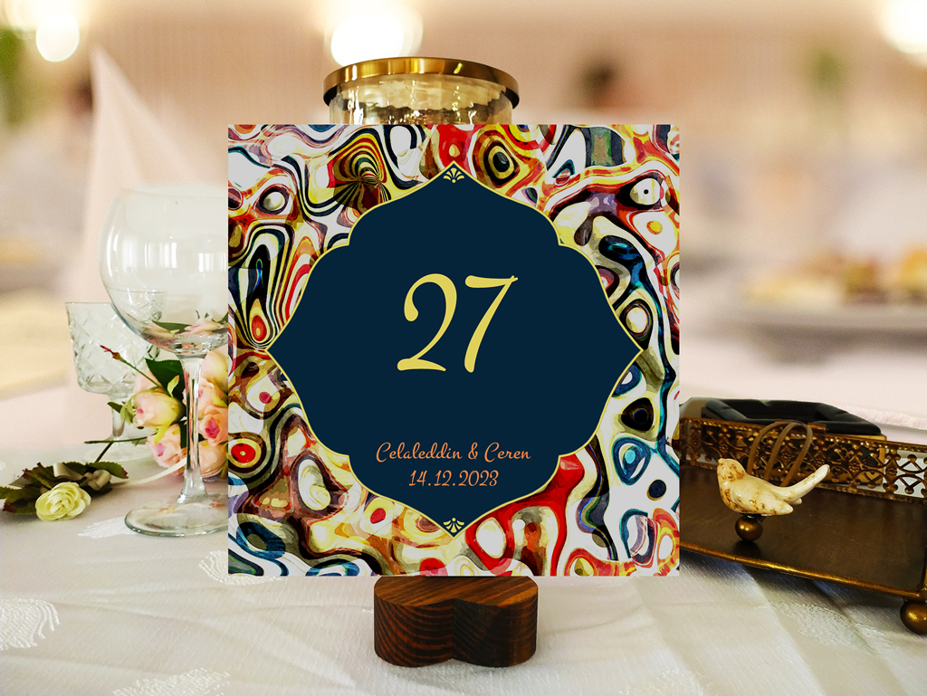 Özel Tasarım 84WedMk Masa Kartı. Kart kuşe zemine renkli desenler temalı baskıdan oluşmaktadır.